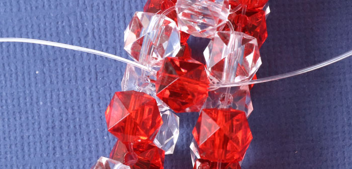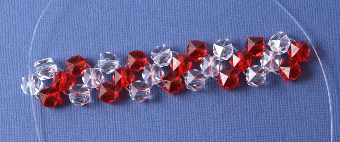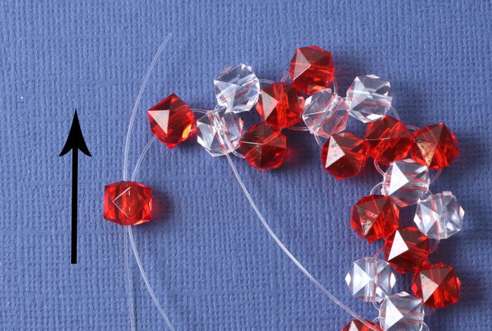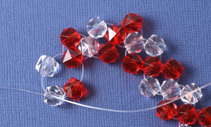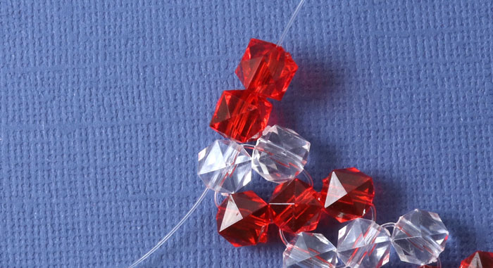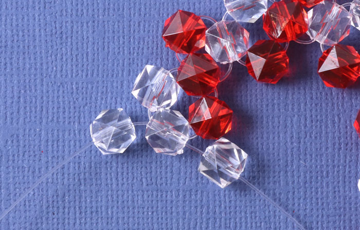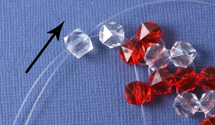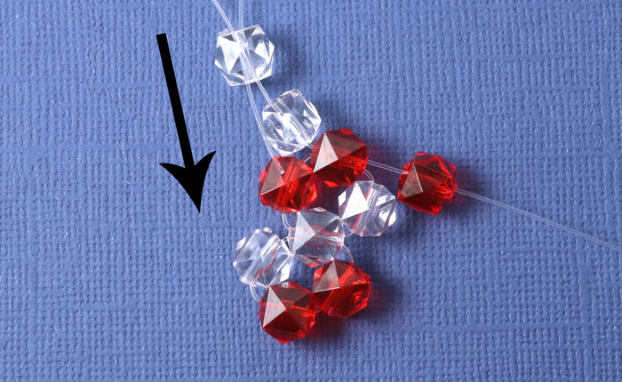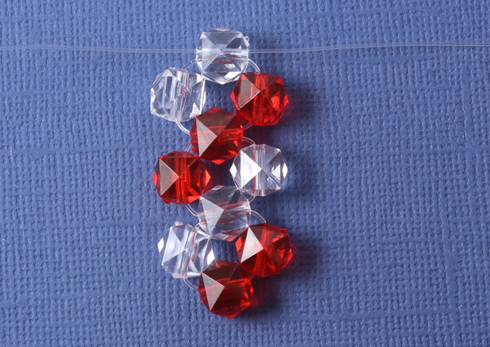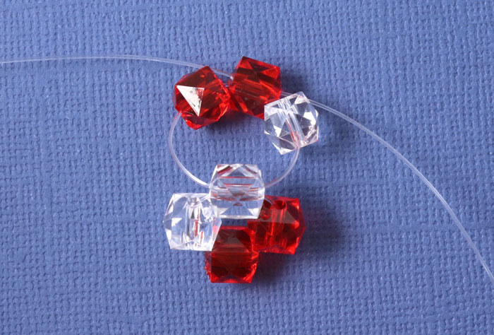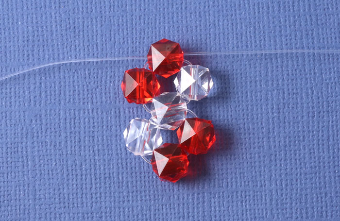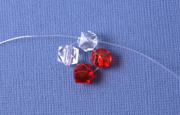 String 4 beads (2 red + 2 clear ones) ... place them in the centre of the thread ... and pass the thread back through one of the clear beads.