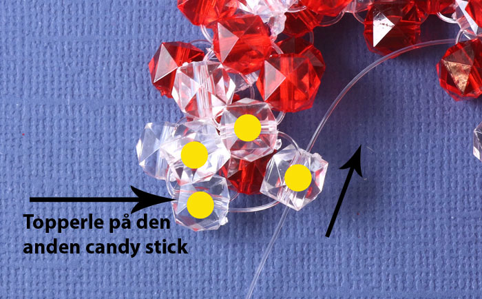 Pass the thread through the top bead of the other candy stick (see arrow - Topperle på den anden candy stick)) ... and back through the 1st clear bead (see picture)
