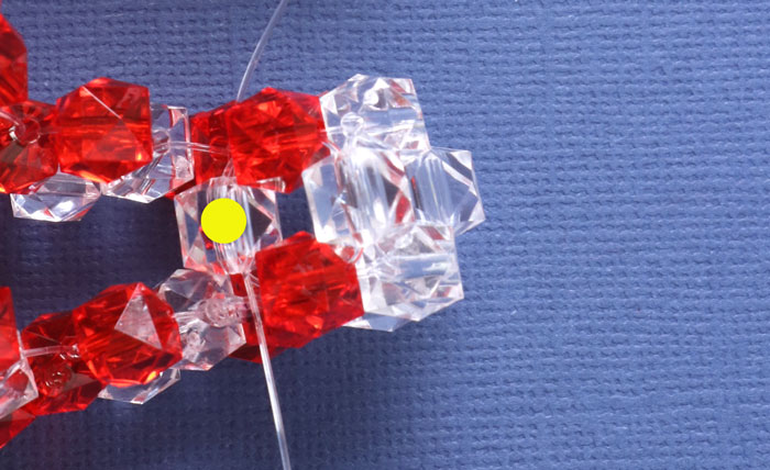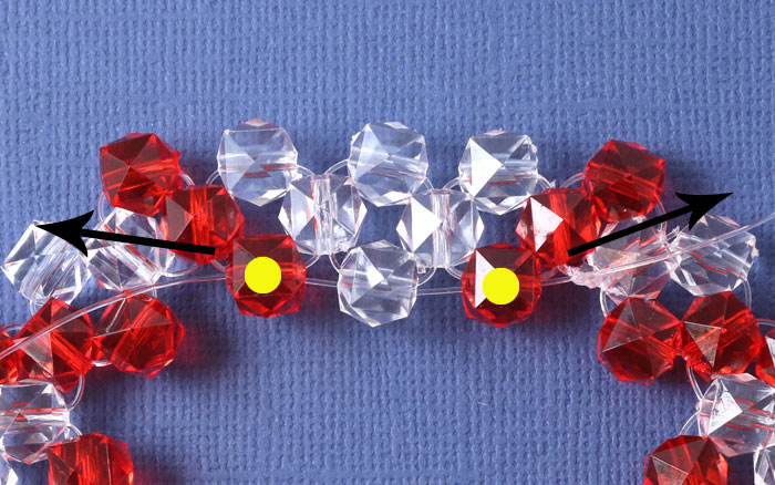 Pass the right thread through the 4 beads marked with yellow dots... so that the thread ends meet.