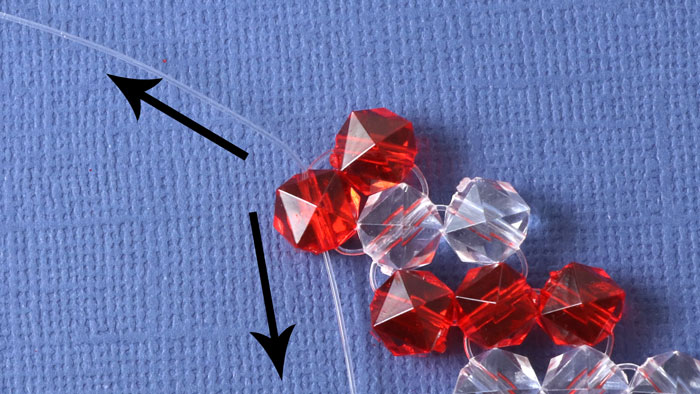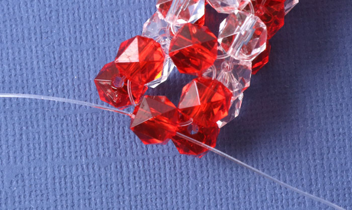 You now pull the thread ends through the red beads lying next to the clear bead. One to the right and the other to the left.