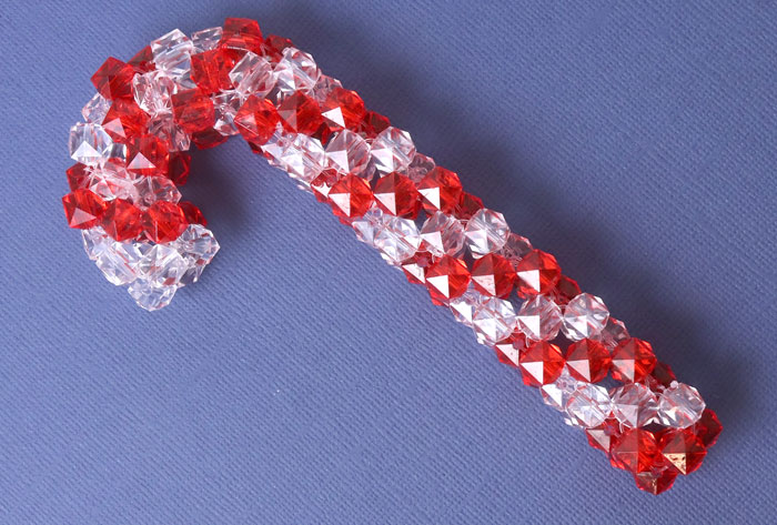 The candy cane is sewn together by forming circles with 1 additional bead... along the entire length of the cane, alternating between a red and a clear bead.